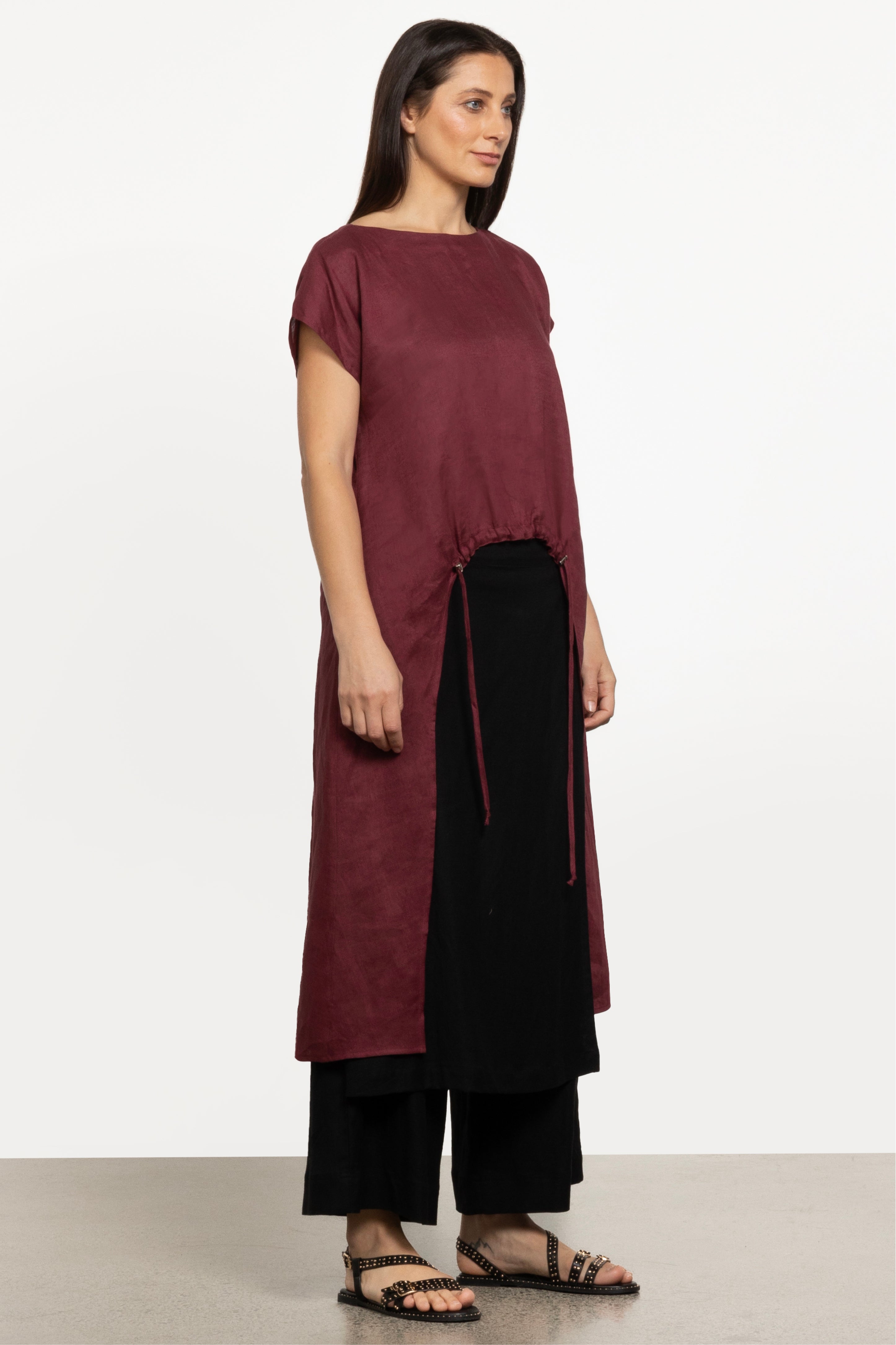 Step into effortless style with the Galaxy Top. This modern piece features a stepped hemline and front gathering with toggle accents for a unique, fashion-forward look. Ideal for casual outings, this linen top pairs easily with your favourite lounge pants or skirts, finished with chunky sandals for a chic yet comfortable ensemble.